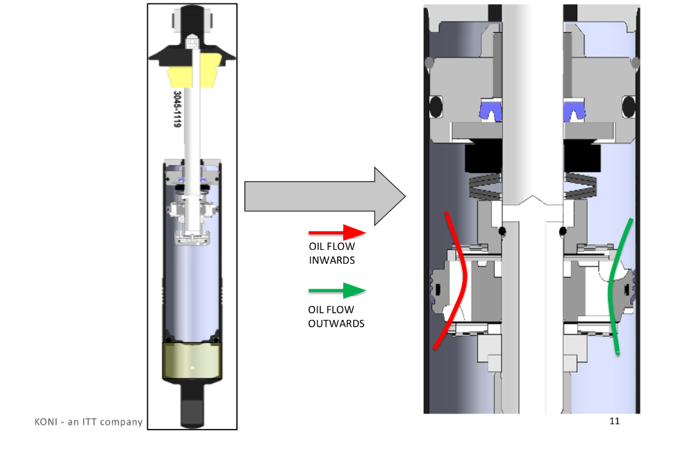 Dans la phase de détente, l’huile située entre le piston et le dispositif de guidage est poussée à travers le piston. La résistance rencontrée crée l’amortissement dans la phase de détente. Du fait de la sortie de la tige, le piston flottant reprendra sa place d’origine.